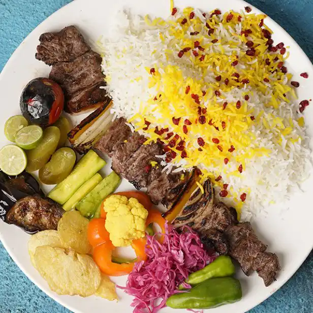 chunks of grilled beef tenderloin, roasted tomato, sumac, fresh herbs, saffron rice