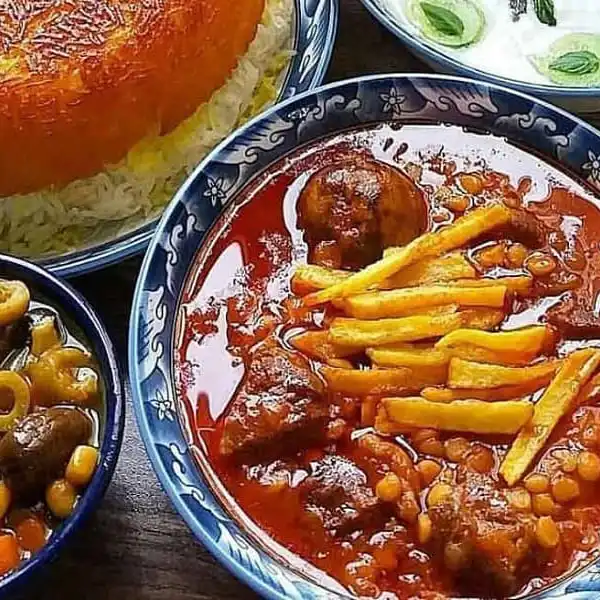 Yellow split peas, beef, dried lime, لیمو امانی, tomato, turmeric, saffron rice, match stick fries
